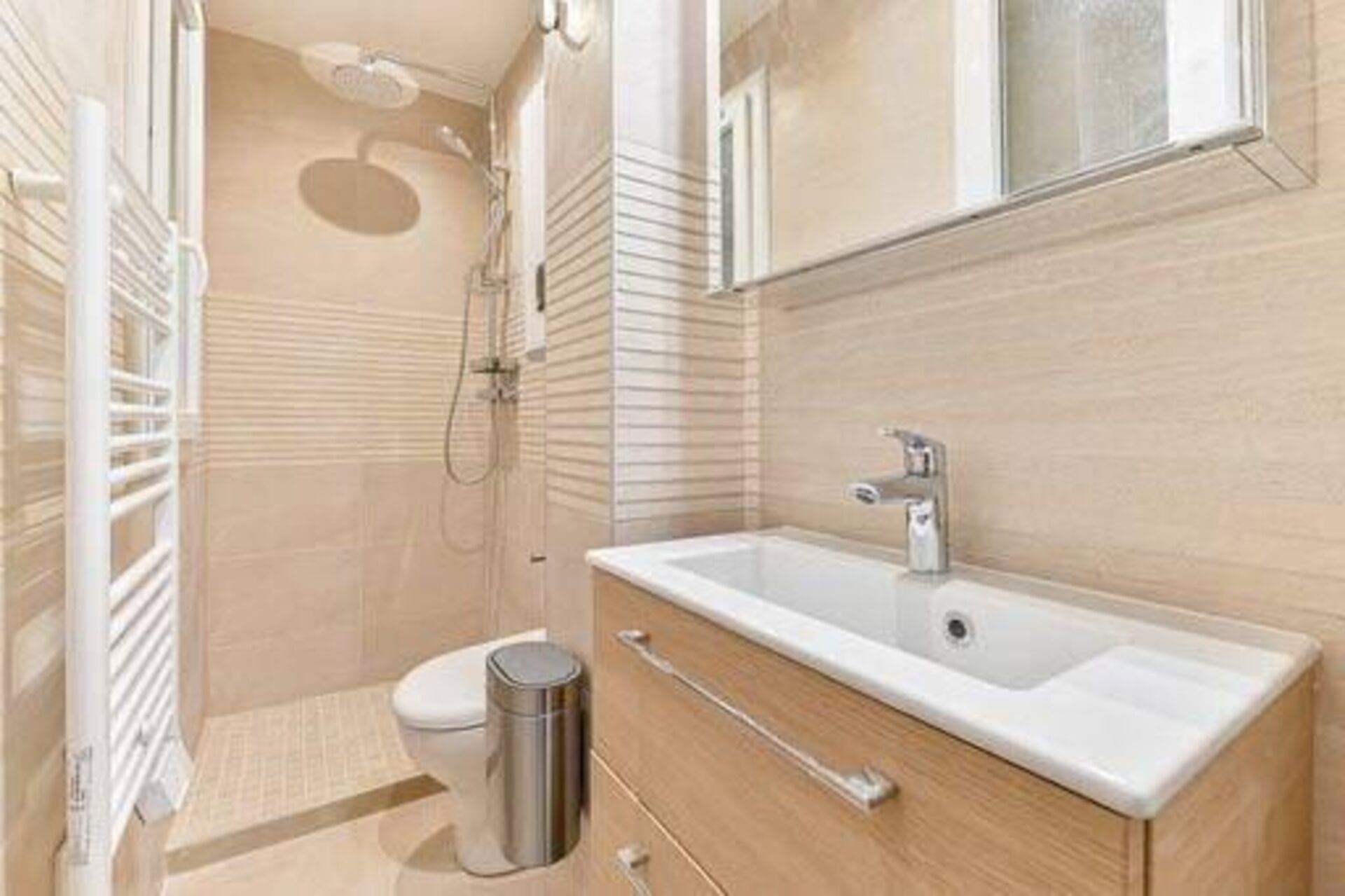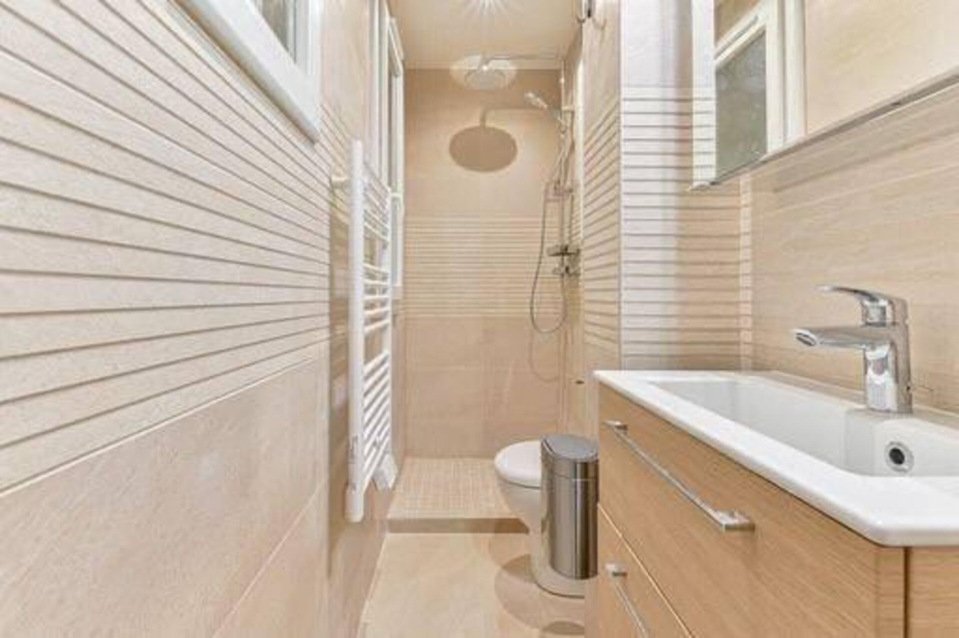 Le sol a été habillé d’un carrelage antidérapant, tandis que les murs ont reçu une faïence claire apportant luminosité et sensation d’espace. La douche à l’italienne sur mesure a été installée avec :